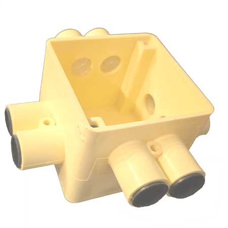 Centraaldoos voor plafond. Afmeting 70x70mm. en een inbouwdiepte van 60mm. met 8 aansluitingen, waarvan 4 hoog 28mm. en 4 laag 10mm. Gemeten vanaf de rand van de buismof tot aan de afdekplaat.