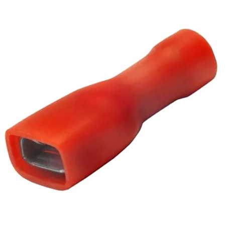 Rode Skandia geïsoleerde vlakstekkerhuls kabelschoen met afmeting 6.3×0.8mm. Geschikt voor ééndraads-doorsnede van 0.5-1.5 mm². Lengte 22mm. 10 stuks in een blisterverpakking.